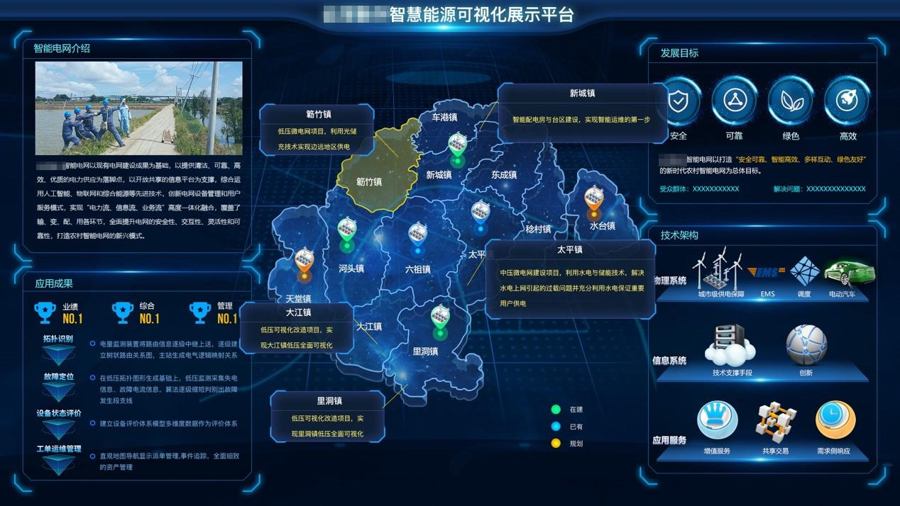 根据《某某电网公司智能电网建设工作方案》工作要求,供电局作为省电网公司试点的农村智能电网示范区之一,2017 年至 2020 年将围绕发电、输电、配电、服务、调度等八大领域召开农村智能电网建设工作,以打造“安全、可靠、绿色、高效的智能电网”为总体目标,结合新兴县“全面建成禅意生态名城、争创县域一二三产业融合开展示范县”的目标,以服务新兴特色产业为突破口,探索农村智能电网建设模式。 智能电网以现有电网建设成果为基础,以给予清洁、可靠、高效、优质的电力供应为落脚点,以开放共享的信息平台为支撑,综合运用大数据、人工智能、物联网和综合能源等先进技术,创新电网设备管理和用户服务模式。 智能电网总体架构可概括为“四大领域+两个支撑体系”。四大领域分别为:安全高效的输变电、灵活可靠的配电、多样互动的用电、清洁友好的综合能源服务,两个支撑体系是广泛部署的通信基础设施和开放共享的智能电网综合数据管理与可视化平台。
