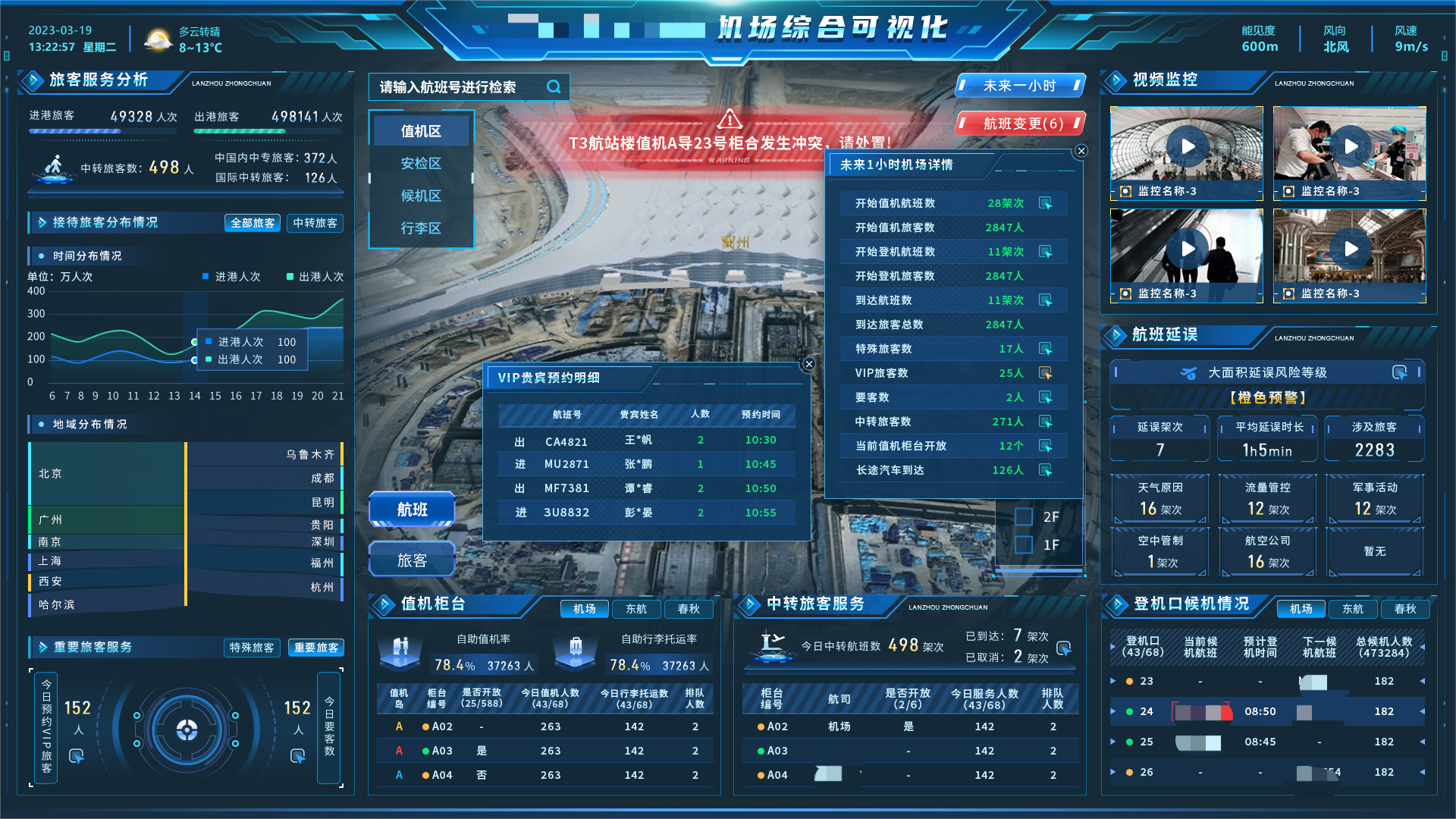 面向机场多角色、多视角、多领域,构建全场景、全要素、全流程的运行可视化:顺利获得全景化数据看板,为机场的高层管理者给予生产运行、运营管理的数据分析,智能分析总体运行概况和态势。顺利获得航路放行、限行信息等,提前掌握航班的飞行、拥堵、航延情况,实现航路动态及预测预警,避免航班延误和取消;顺利获得物联网传感器实时监控机位状态、航空器位置及地面保障进度,智能调整机位分配方案。实时统计分析登机口占用分布、登机口变更比例,行李转盘占用分布等主要服务指标,对关键指标进行预测和优化分析,合理分配各路资源,实现全流程服务链可视和诉求精准响应。